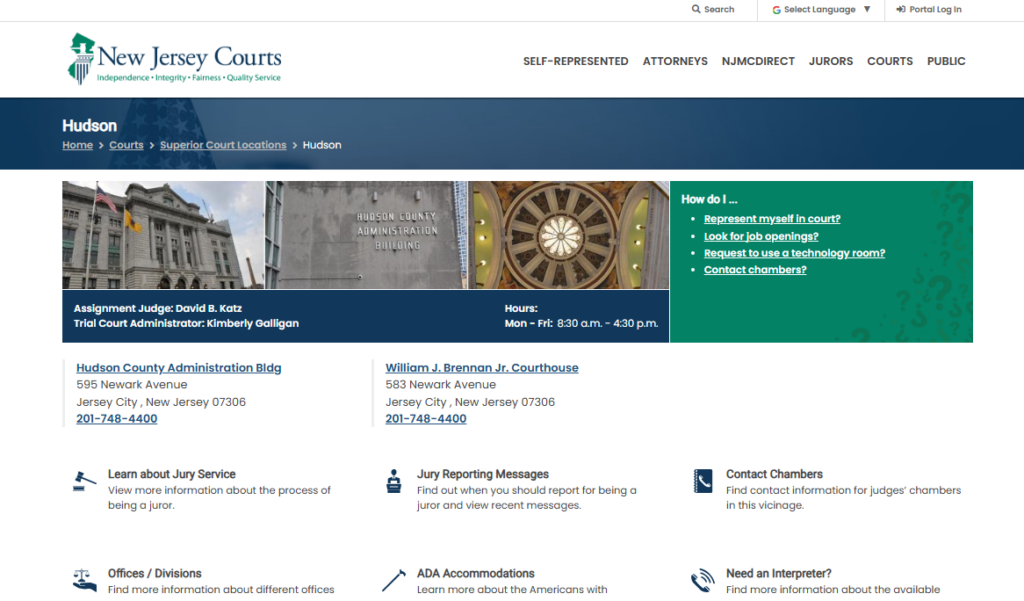 - Superior Court, Hudson County: Handles serious civil lawsuits, criminal indictments, family court issues, and probate matters.
